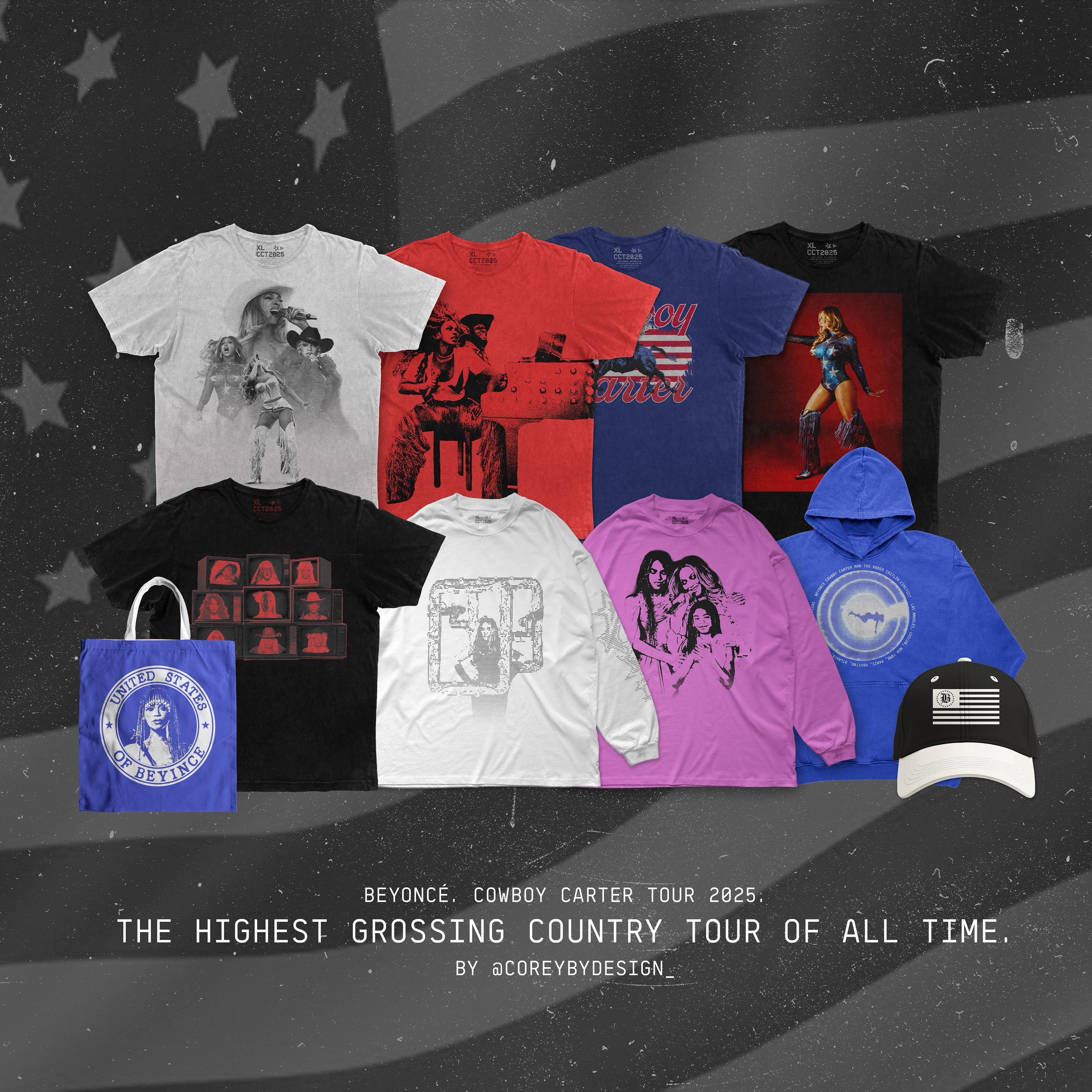 A conceptual merch capsule I created to celebrate the announcement of Beyoncé's Cowboy Carter Tour becoming the highest grossing country tour of all time. The capsule includes t-shirts, pullovers, hats and more!